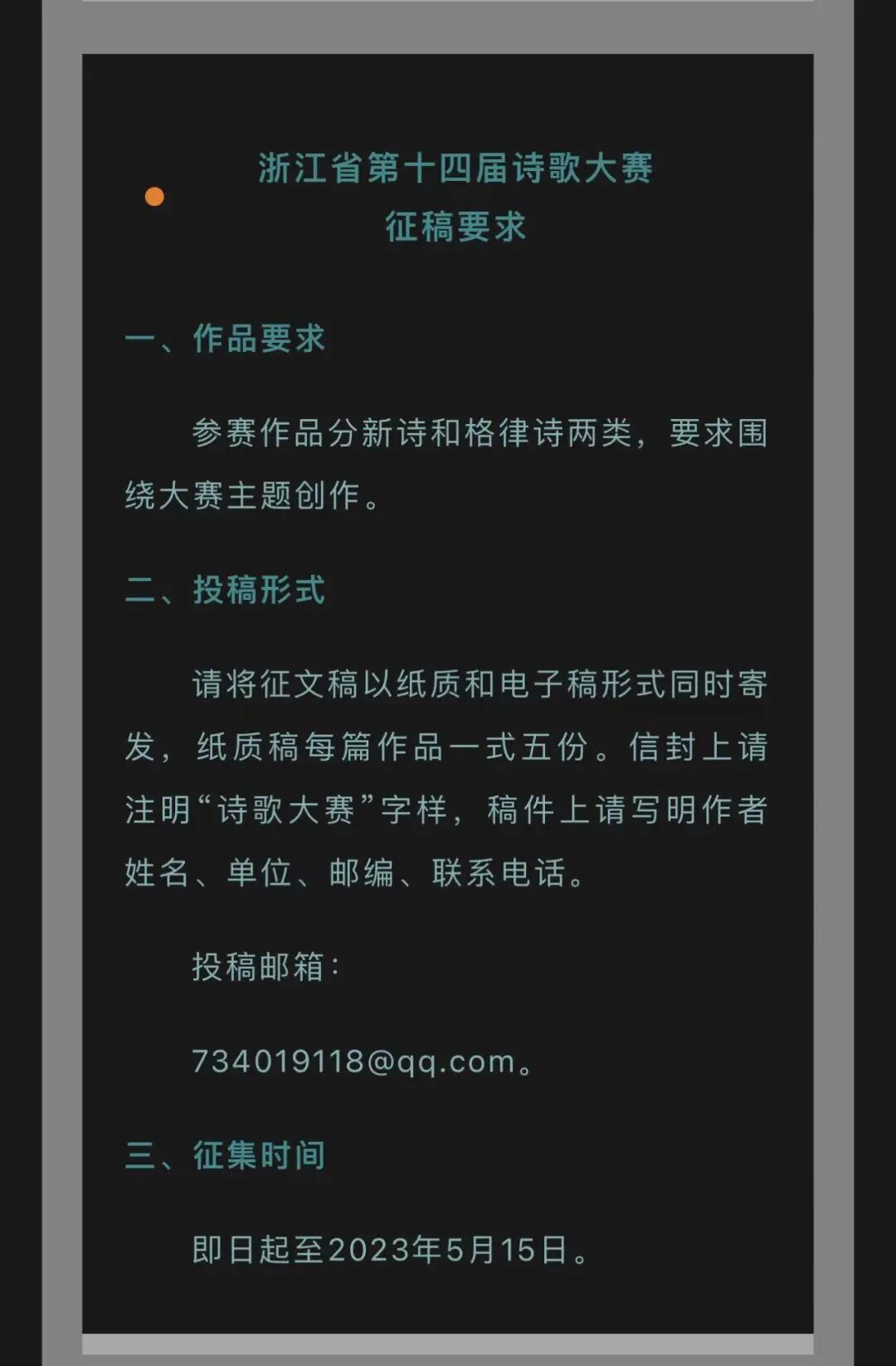 浙江省第十四届诗歌大赛开始投稿啦![color=var(--weui-FG-2)]龙泉旅游 [color=var(--weui-LINK)][url=]征文天下[/url] [color=var(--weui-FG-2)]2023-04-30 15:38 [color=var(--weui-FG-2)]发表于吉林