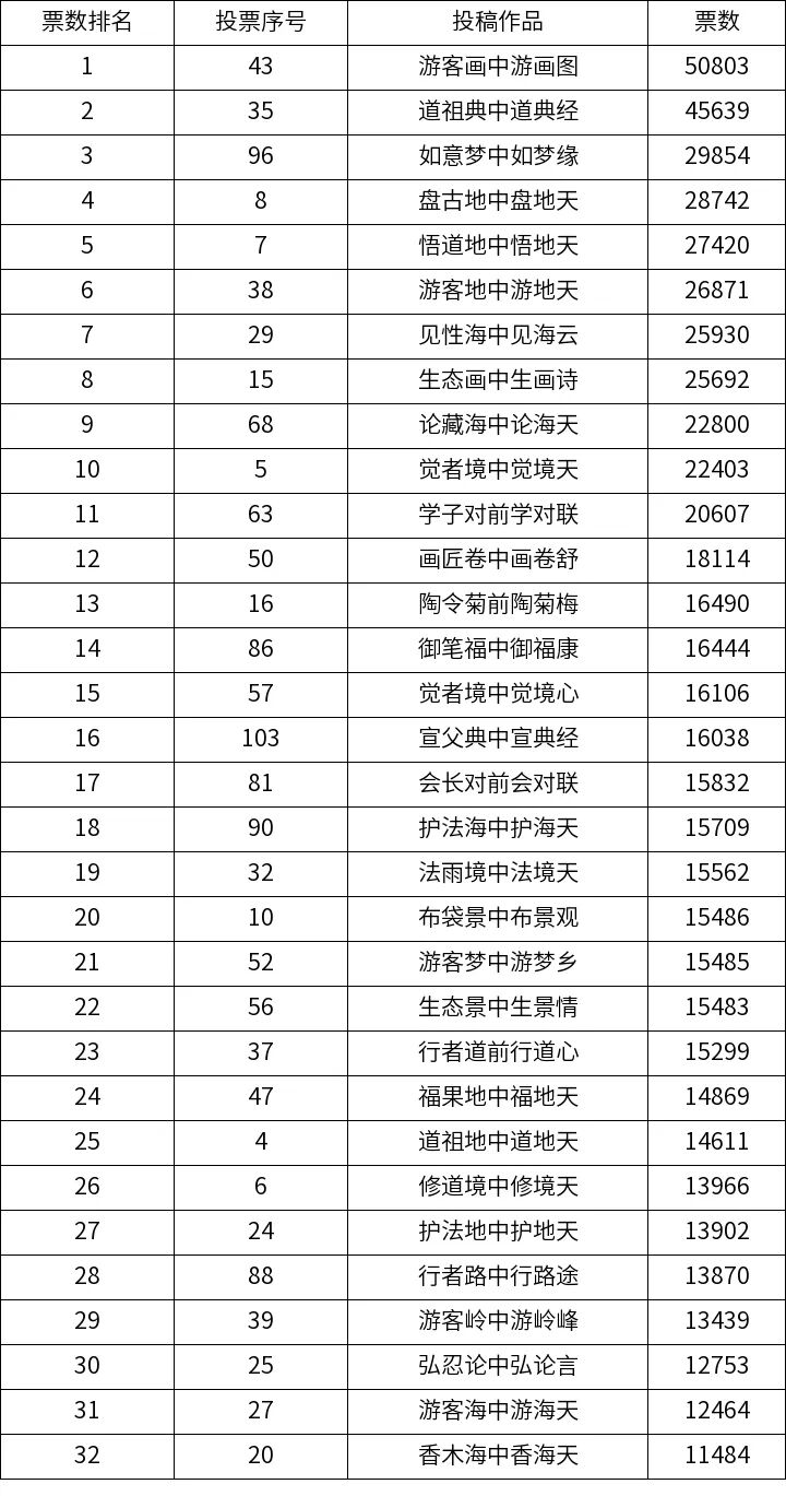 本次征联活动网络投票环节,根据征联小程序统计,累计得票数排行前32名,结果公告如下: