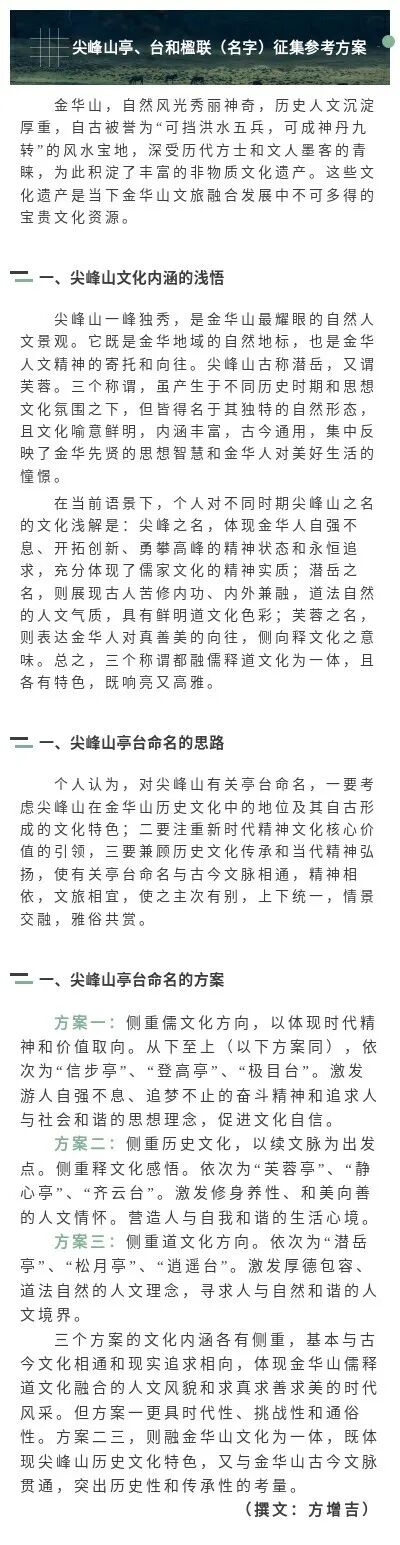 为进一步推进尖峰山文化建设,塑造尖峰山文旅新形象,现决定面向全社会各界人士,开展尖峰山亭、台名称及楹联征集活动。本次活动由金华仙山文化产业有限公司组织。