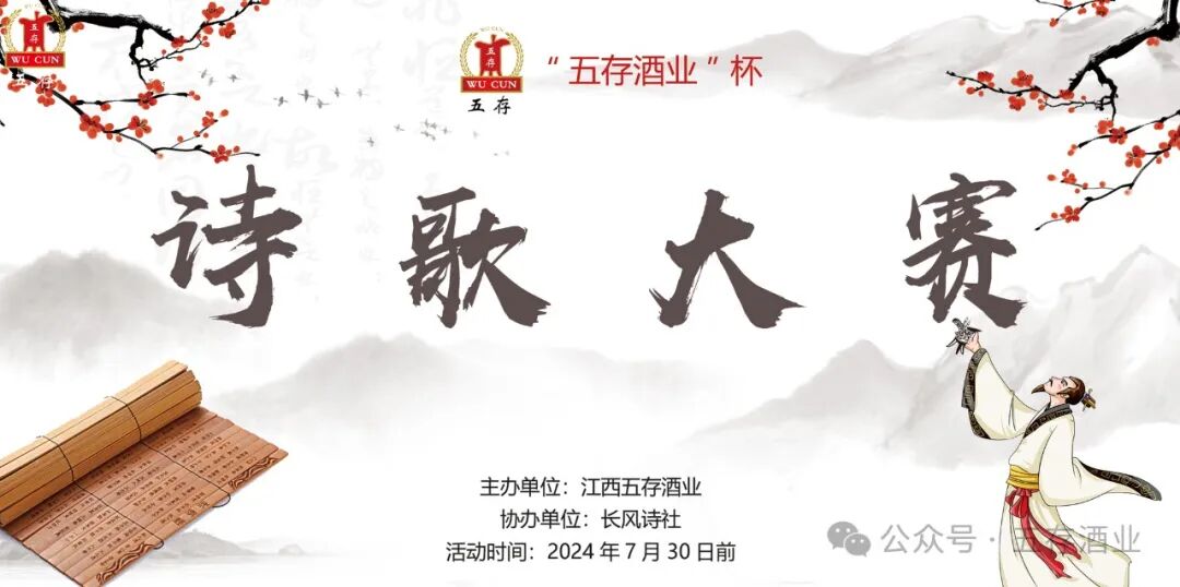 为了将诗与酒完美结合,讴歌五溪丁氏家族的荣光以及江西五存酒业的诗酒文化,弘扬老法酿酒,挖掘人间乡愁,传承非物质文化遗产,由五存酒业与长风诗社联合主办,第二届“五存酒业”杯全国诗歌大奖赛现面向全国征稿。现将有关征稿启事公布如下: 一、征稿体裁 现代诗歌 二、征稿对象 海内外文学爱好者,酒文化爱好者 三、奖项设置 一等奖3个,价值5328元五存礼鉴藏品款酒52度一箱; 二等奖6个,价值4080元五存礼鉴藏品款酒46度一箱; 三等奖12个,价值2988元五存1962纪念版52度一箱; 优胜奖30个以上,价值996元五存1962纪念版52度一提。 获奖作品结集出版 获奖作者发给证书、寄赠样书。 拟举行专题诗歌朗诵会,邀请部分获奖作者参加。 四、来稿要求 1、作品要求围绕“以丁氏家族光荣史及江西五存酒为主题”,以五存酒为题材,挖掘五存酒的故事,突出五存酒的文化属性。 2、来稿标题自拟,行数40行之内,欢迎短诗,每人最多投2首。 3、来稿请在2024年7月30日前发至电子信箱: 565886383@qq.com。稿件请复制在写信栏内,不要作为附件发送。请不要重复发送。要求注明作者姓名、及详细通讯地址、联系电话。 4、五存酒业拥有获奖作品的免费使用权。 5、来稿文责自负,不得抄袭,不退稿。 6、咨询电话:13170877121 《第二届“五存酒业”杯全国诗歌大奖赛》