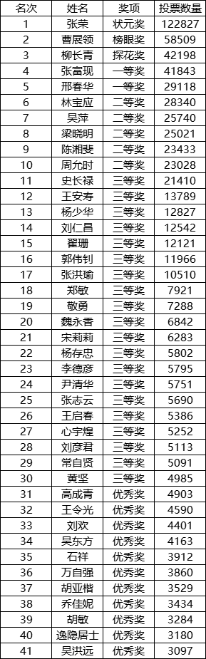 一等奖:张富现、邢春华 二等奖:林宝应、吴萍、梁晓明、陈湘斐、周允时 三等奖:史长禄、王安寿、杨少华、刘仁昌、翟珊、郭伟钊、张洪瑜、郑敏、敬勇、魏永香、宋莉莉、杨存忠、李德彦、尹清华、张志云、王启春、心宇煌、刘彦君、常自贤、黄坚 优秀奖:高成青、王令光、刘欢、吴东方、石祥、万自强、胡亚楷、乔佳妮、胡敏、逸隐居士、吴洪远