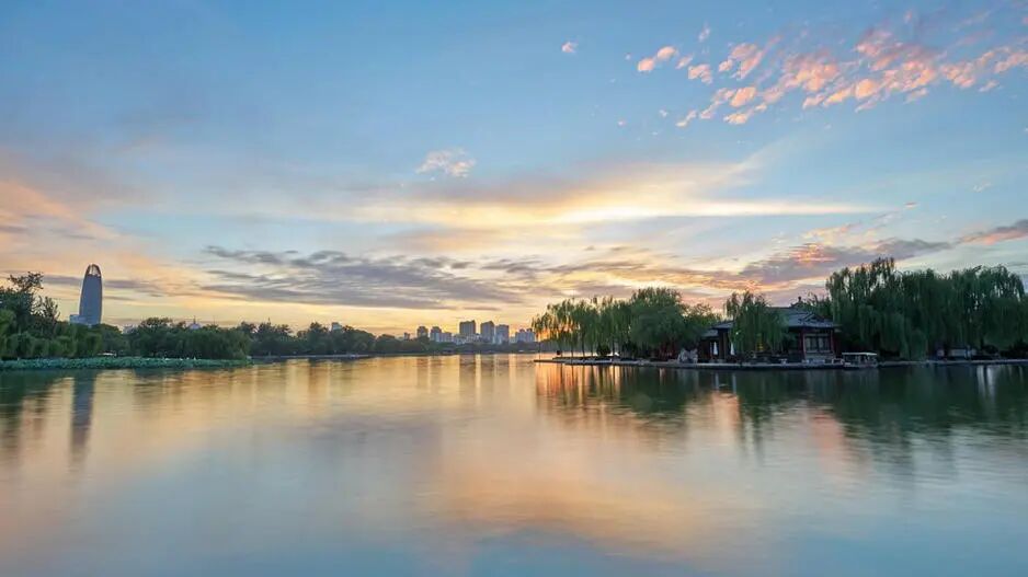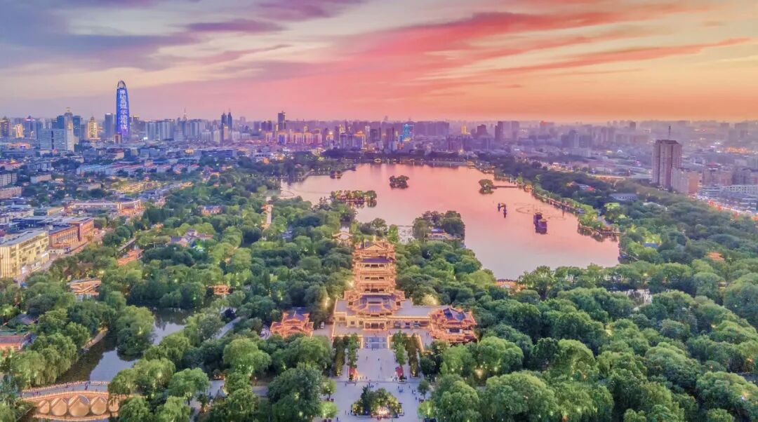 朱鹮舞,荷花笑,柳絮翩。舜耕历下,大象小鸟正争先。弃疾挑灯看剑,老舍著书忧国,山翠引红鸾。水碧迎丹凤,诗画写清欢。