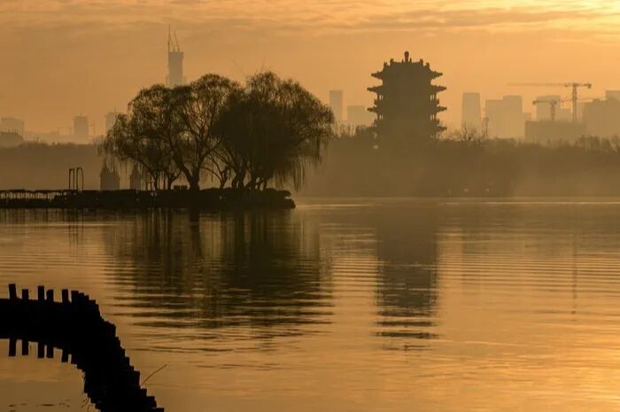 一镜波光接远天,长堤小坐柳丝缠。亭台有意迎新客,楼阁多情念古贤。