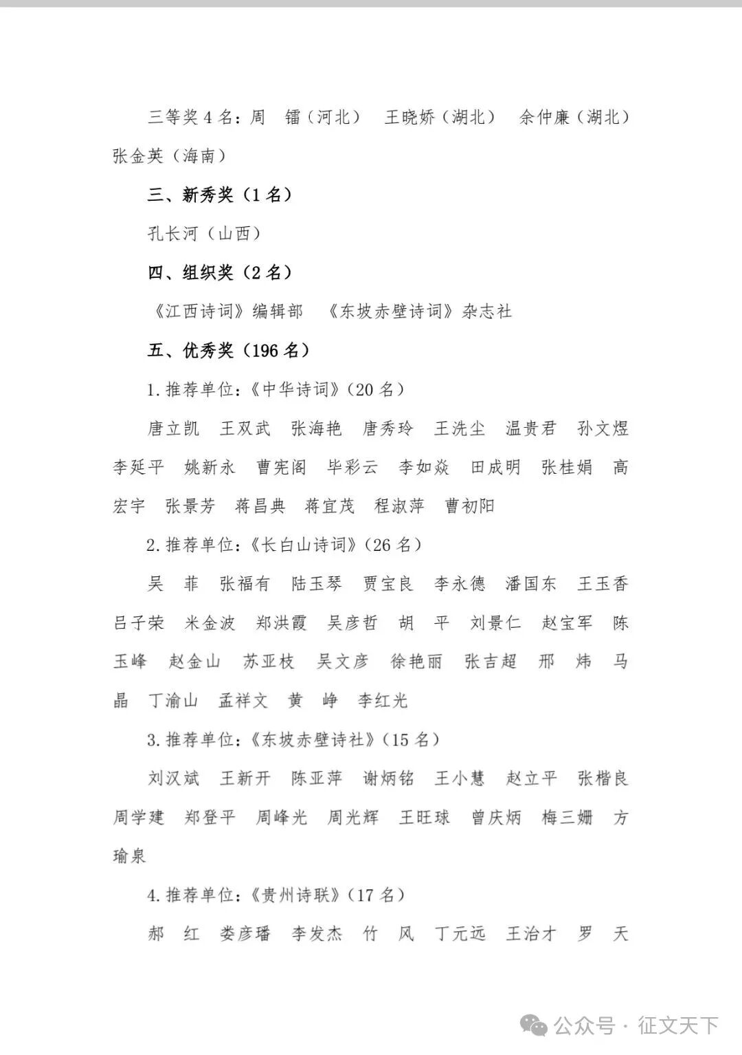 为了深入贯彻学习习近平文化思想,弘扬传承中华优秀诗词文化,推动新时代孟浩然新田园诗的创作与研究,擦亮“襄阳孟浩然”城市名片,助力汉襄宜“金三角”文化协同发展,根据中华诗词学会《“长春杯”孟浩然新田园诗邀请赛办法》(中诗字〔2022〕06号),由孟浩然新田园诗邀请赛组委会主办的第六届“长春杯”孟浩然新田园诗邀请赛经过初评、复评、终评等环节,现将获奖结果公布如下: 一、创作奖(8名) 一等奖1名:眭 珊(广西) 二等奖3名:罗 伟(上海) 马 翚(宁夏) 杨定朝(湖南) 三等奖4名:王 宇(湖北) 翟红本(河南) 丁 欣(江苏) 叶子金(湖北) 二、评论奖(8名) 一等奖1名:曾茹婷(湖北) 二等奖3名:王钻清(广东) 张 嵩(宁夏) 杨 卓(天津) 三等奖4名:周 镭(河北) 王晓娇(湖北) 余仲廉(湖北) 张金英(海南) 三、新秀奖(1名) 孔长河(山西) 四、组织奖(2名) 《江西诗词》编辑部 《东坡赤壁诗词》杂志社 五、优秀奖(196名) 1.推荐单位:《中华诗词》(20名) 唐立凯 王双武 张海艳 唐秀玲 王洗尘 温贵君 孙文煜 李延平 姚新永 曹宪阁 毕彩云 李如焱 田成明 张桂娟 高宏宇 张景芳 蒋昌典 蒋宜茂 程淑萍曹初阳 2.推荐单位:《长白山诗词》(26名) 吴 菲、张福有、陆玉琴、贾宝良、李永德、潘国东、王玉香、吕子荣、米金波、郑洪霞、吴彦哲、胡 平、刘景仁、赵宝军、陈玉峰、赵金山、苏亚枝、吴文彦、徐艳丽、张吉超、邢 炜、马 晶、丁渝山、孟祥文、黄 峥、李红。 3.推荐单位:《东坡赤壁诗社》(15名) 刘汉斌、王新开、陈亚萍、谢炳铭、王小慧、赵立平、张楷良、周学建、郑登平、周峰光、周光辉、王旺球、曾庆炳、梅三姗、方瑜泉 4.推荐单位:《贵州诗联》(17名) 郝 红娄彦璠李发杰竹 风丁元远王治才罗 天文前举赵正乾丁垂赋杨丽萍秦应康谢 谨岑 梅张 勇彭俊枫王 宏 5.推荐单位:《江西诗苑》(6名) 何建洋胡迎建 黄志平 祝红星 胡三元 郑志刚 6.推荐单位:《中州诗词》(8名) 王鸿贤邓炳林 耿西岭 吴海晶 李秀芝 程新乾 马良贤 李 芳 7.推荐单位:《湖北诗词》(16名) 丁群怀舒祖华 刘仁松 黄丽萍 马华张建国 李远鹏 张鑫波 李琳 林大谟吴泰山 石松林 陈波蔡荣耀 李齐林刘伦煜 8.推荐单位:《内蒙古诗词》(4名) 高科 赵丽春 白秀萍 闫宝林 9.推荐单位:《难老泉声》(4名) 刘志孝赵 青 刘磊峰 裴耀东 10.推荐单位:《历山诗苑》(12名) 刘毕新仇绪芳 全凤群 刘清华 苑小红 刘国荣 李新兵 吕星宇 张玉欣 高凤梅 包美荣 卢玉莲 11.推荐单位:《襄水曲》(8名) 陈有来王传安 刘小露 夏 祯 田源孝 张德操 王雪敏 章长茅 12.推荐单位:《烟台诗词》(6名) 朱本喜张敬爱 黄友富 王 峰 刘学刚 郭顺敏 13.推荐单位:《九州诗词》(7名) 魏小乐汪新军 陈业秀 朱玉明 冯 平 王淑梅 董瑞霞 14.推荐单位:《当代诗词》(13名) 郑 力 徐雪晴 唐 风 李长松 杨定朝 程造之 张建雄 雷经升 陈雅国 李国栋 刘建丽 王梦阳 蒋江峰 15.推荐单位:《当代散曲》(15名) 贾文明王云飞 高志文 贾清贤 赵春林 任尚礼 罗家禄 李智旺 弓美平 聂俊英 贾柏林 高在福 冯 赟 杨莉芬 王醒云 16.推荐单位:《诗词月刊》(19名) 陈璋平黄耿宏 傅平艳 孙 宁 詹立辉 康少荣 胡艳隶 魏金璇宋阳玲 李秀珍 徐依武 吕耀英 谢贻知 于红军 段 飞 金芳标李德胜 冯树良 温吉祥