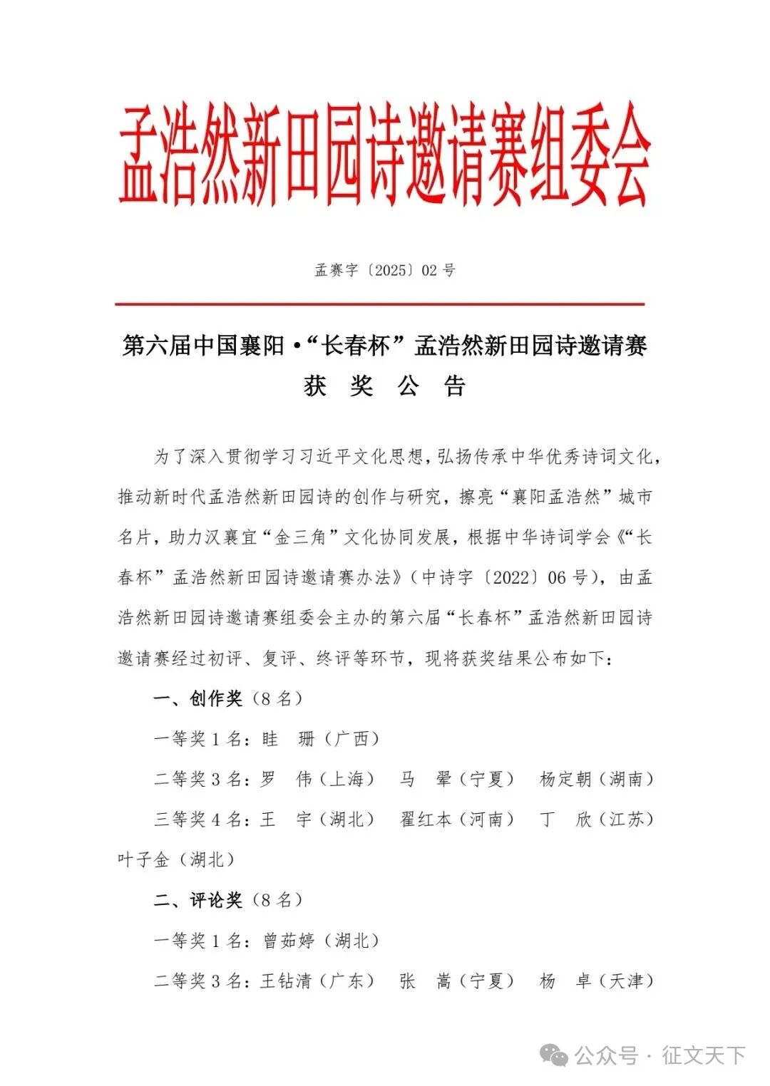 [color=var(--weui-FG-HALF)]第六届中国襄阳·“长春杯”孟浩然新田园诗邀请赛获奖公告