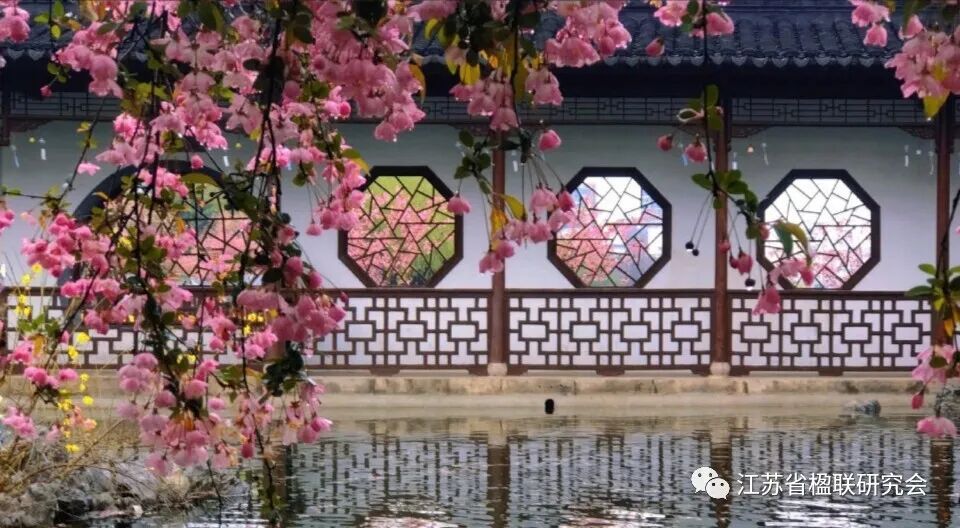 381 莫愁湖(新声) 春日海棠,夏日荷花,集万种芳菲,难比莫愁颜色好; 濯缨碧水,濯足沧浪,醉一湖明艳,重来览胜物华新。
