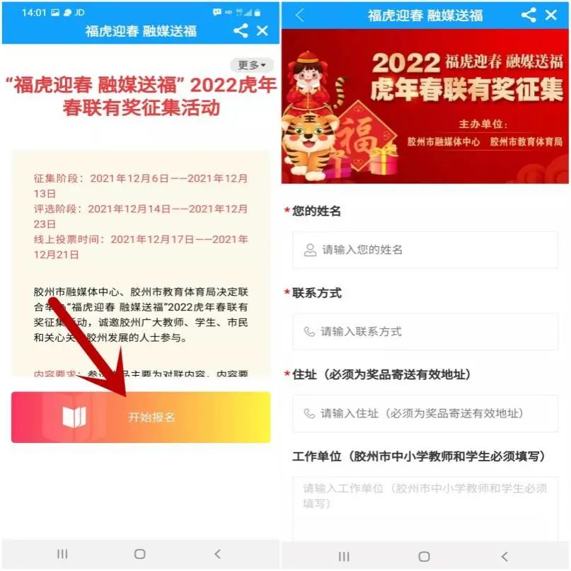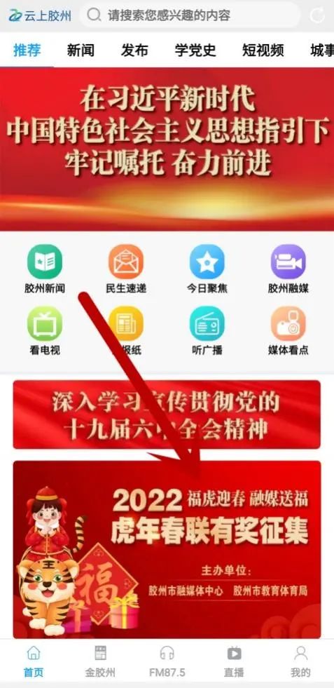 进入“云上胶州”APP首页,点击进入【“福虎迎春融媒送福”2022虎年春联有奖征集】活动专区。