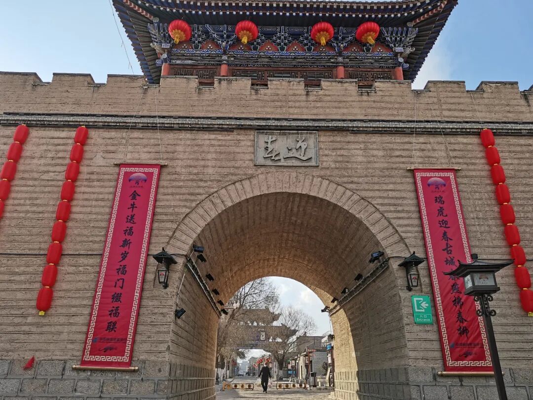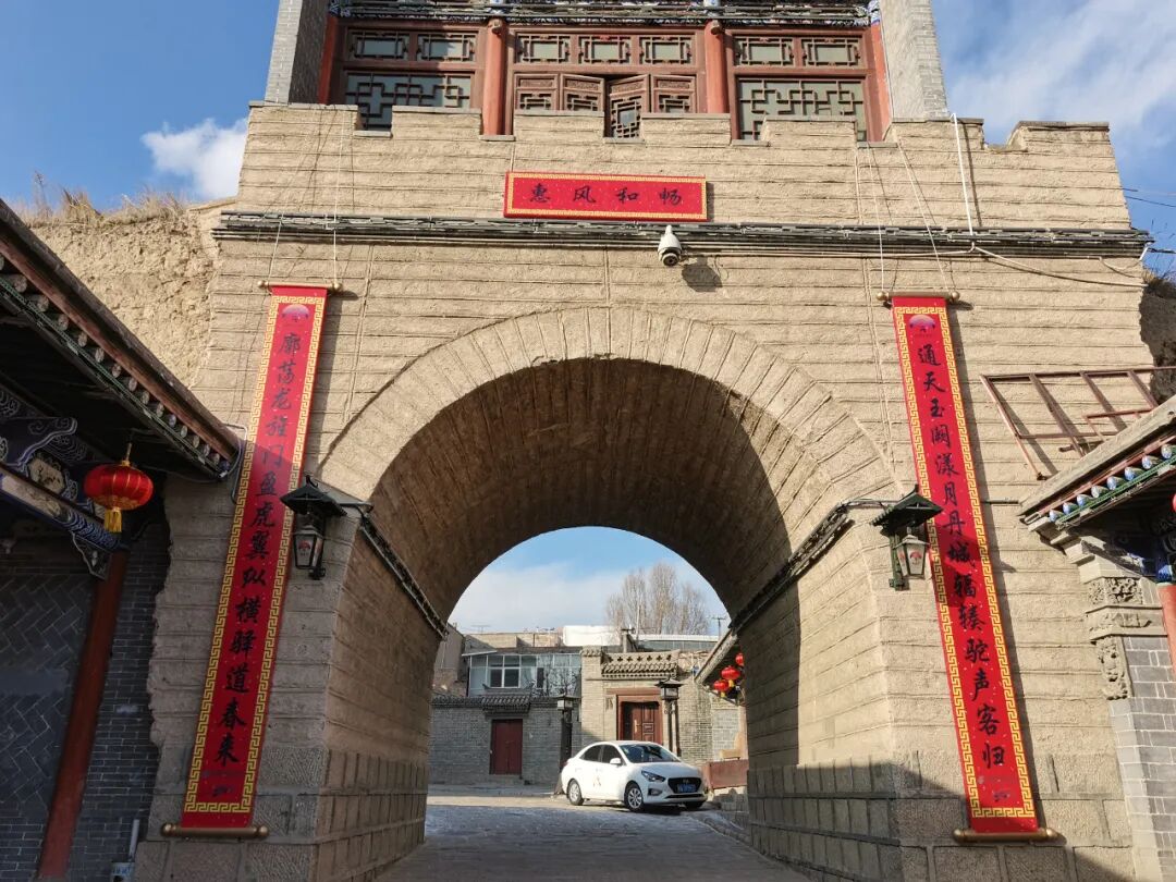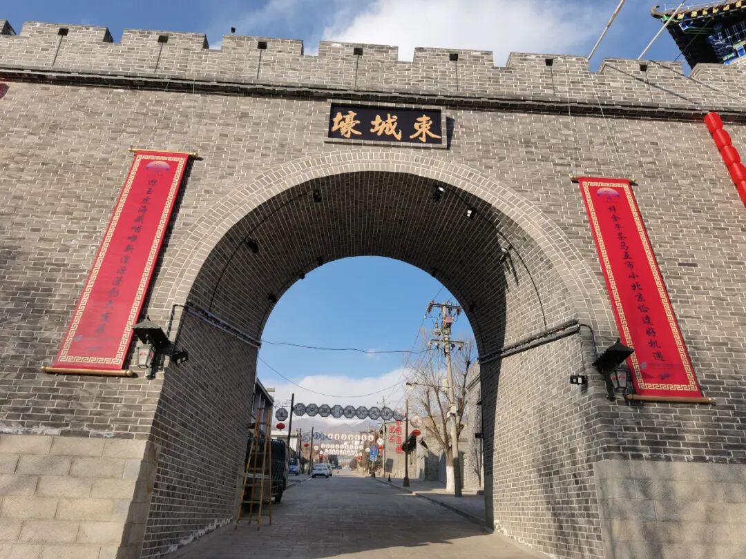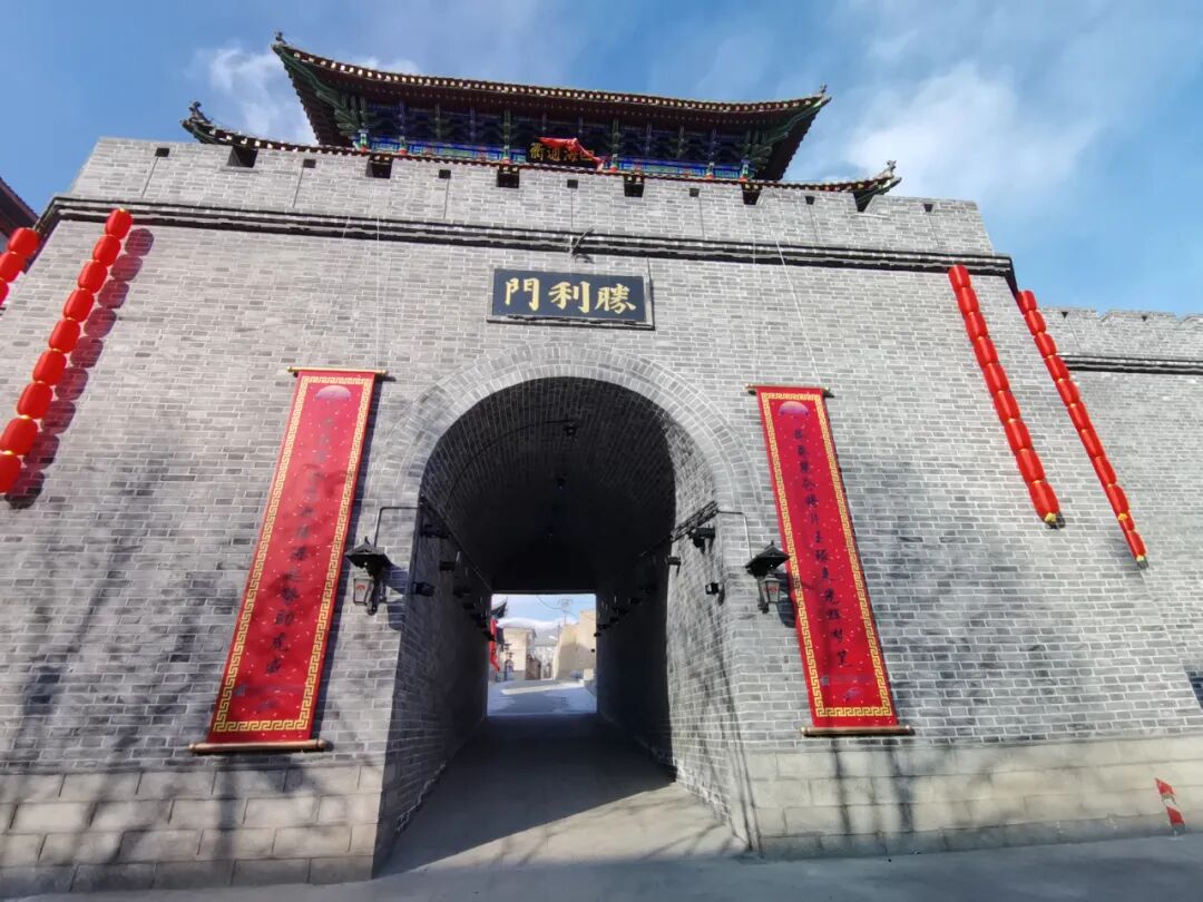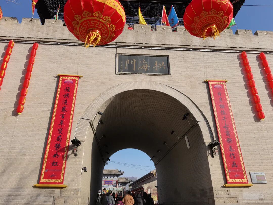 上联:通天玉阙漾月丹城辐辏驼声客归 下联:廓荡龙旌门盈虎翼纵横驿道春来 横批:惠风和畅 东城壕城门
