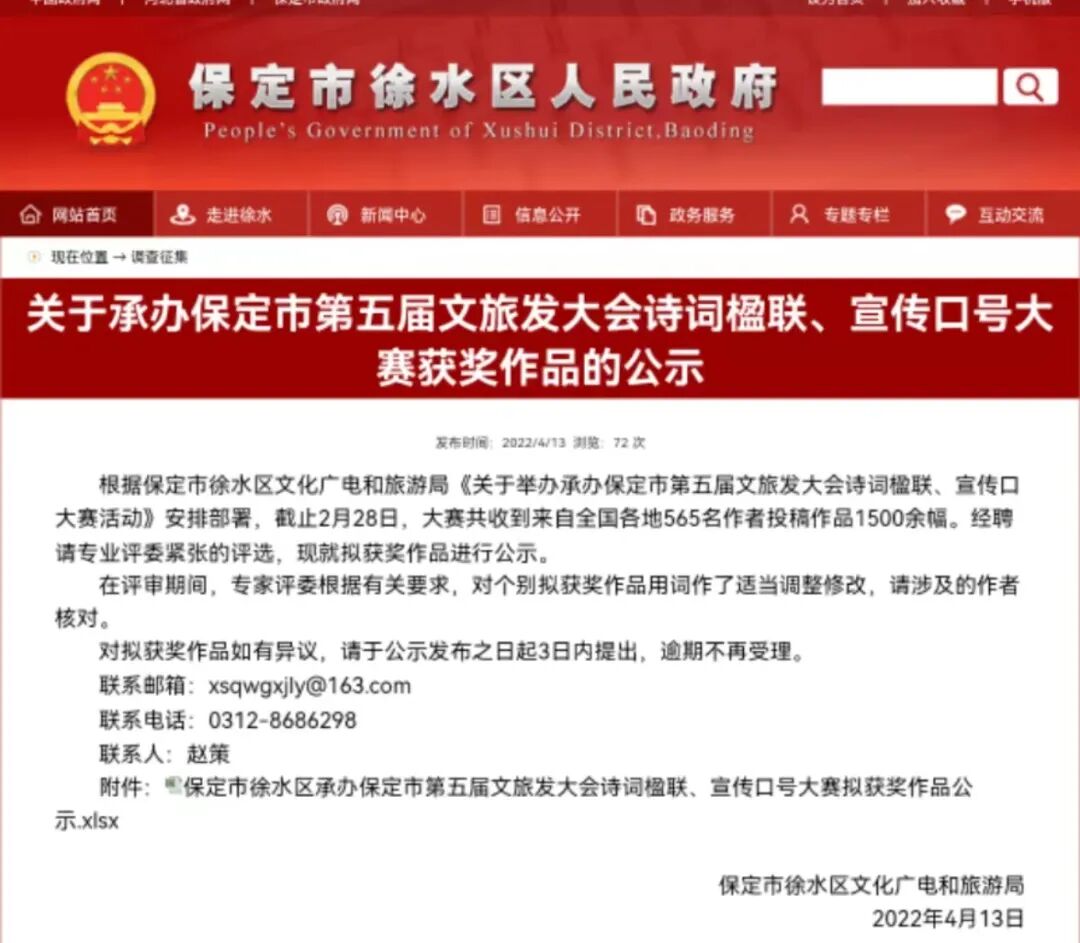 根据保定市徐水区文化广电和旅游局《关于举办承办保定市第五届文旅发大会诗词楹联、宣传口大赛活动》安排部署,截止2月28日,大赛共收到来自全国各地565名作者投稿作品1500余幅。经聘请专业评委紧张的评选,现就拟获奖作品进行公示。 在评审期间,专家评委根据有关要求,对个别拟获奖作品用词作了适当调整修改,请涉及的作者核对。 对拟获奖作品如有异议,请于公示发布之日起3日内提出,逾期不再受理。 联系电话:0312-8686298 联系人:赵策