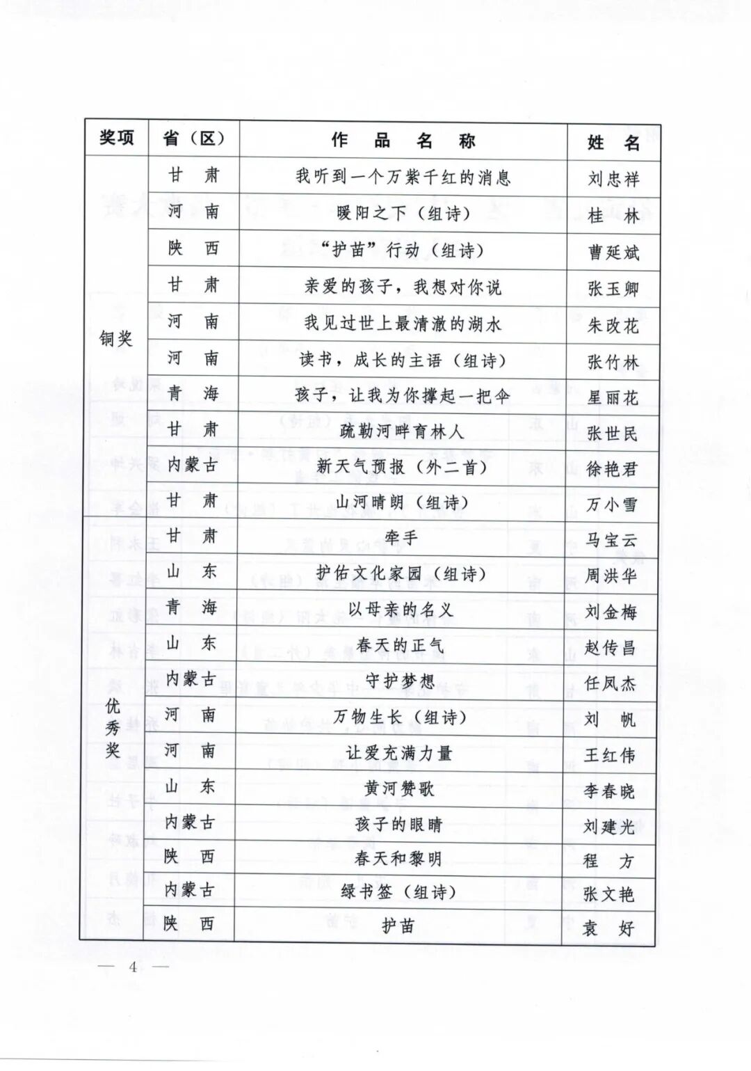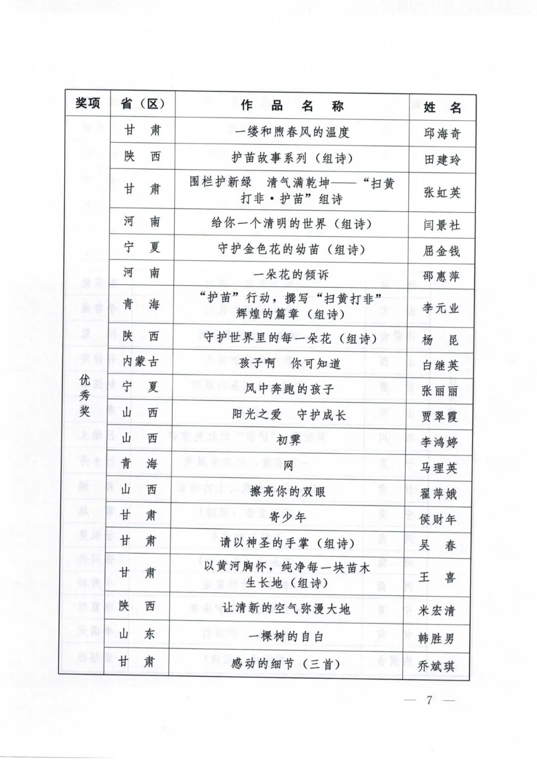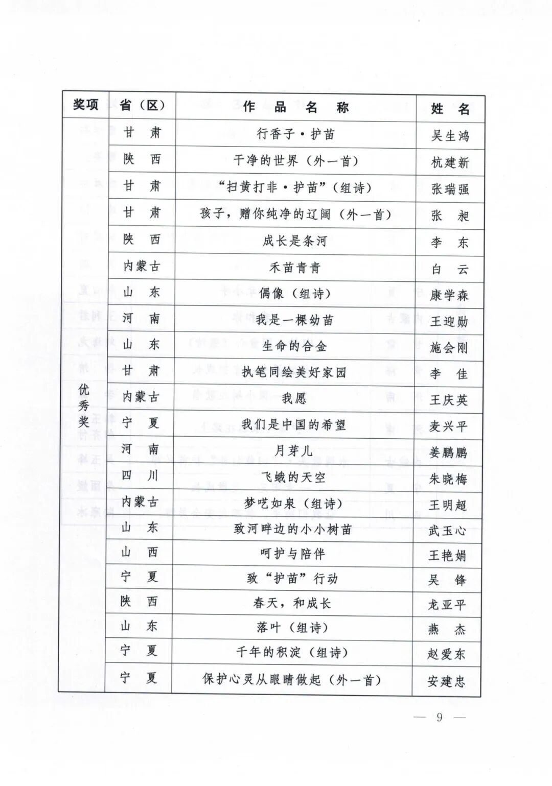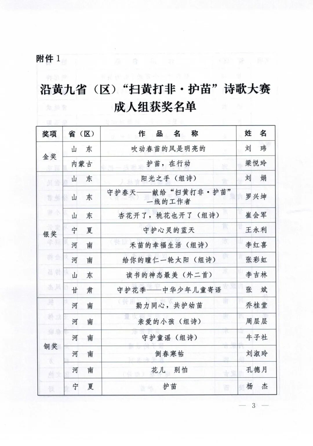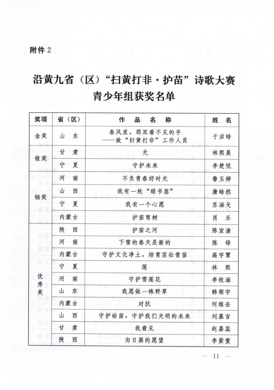 沿黄九省(区)“扫黄打非·护苗”诗歌大赛结果公布了!近日,沿黄九省(区)“扫黄打非·护苗”诗歌大赛获奖名单揭晓。《吹动春苗的风是明亮的》等213篇作品获奖。黄河是母亲河,也是诗河,奔流不息的黄河涌流着滔滔不绝的诗意,每一朵浪花都共鸣着中华民族文化的节奏和韵律。今年2月份起,为认真落实全国“扫黄打非”办公室关于“护苗”工作的总体部署,深化“护苗”品牌宣传,共同营造让孩子们健康成长的文化环境,沿黄九省 (区) “扫黄打非”办公室联合主办了“扫黄打非·护苗”诗歌大赛。此次诗歌大赛立足黄河流域的人文特色,突出“护苗”行动的时代意义,厚植“护苗”行动理念,向全社会发出了净化文化环境、弘扬新风正气的强烈号召!大赛启动以来,沿黄九省 (区) “扫黄打非”办公室精心组织,社会各界广泛关注,广大诗歌爱好者踊跃参赛。大赛组委会共收到766篇推荐作品,经汇总整理及评审委员会专家评审,最终评出优秀作品213篇。其中成人组金奖2名、银奖8名、铜奖16名、优秀奖135名,青少年组金奖1名、银奖2名、铜奖4名、优秀奖45名。沿黄九省(区)通过联合举办“扫黄打非·护苗”诗歌大赛,进一步丰富提升了省(区)间的联防协作,以诗歌这一文学方式推动更多人了解、认可“护苗”行动并积极参与到“护苗”行动中来,进一步巩固了“扫黄打非”工作基层防线。
