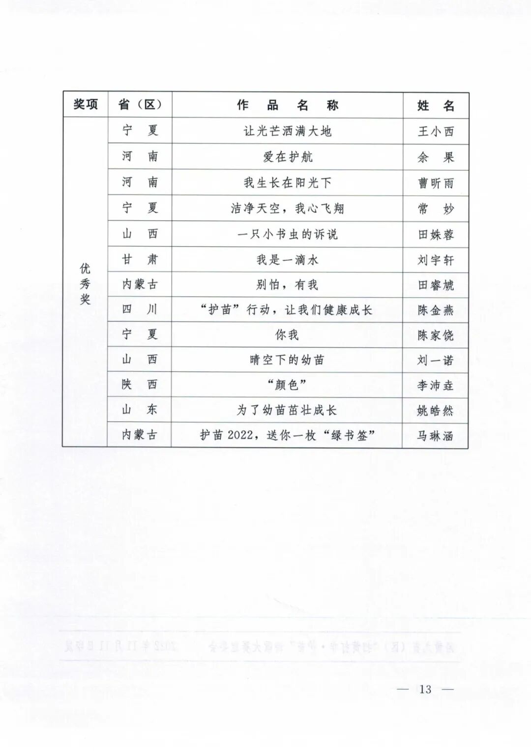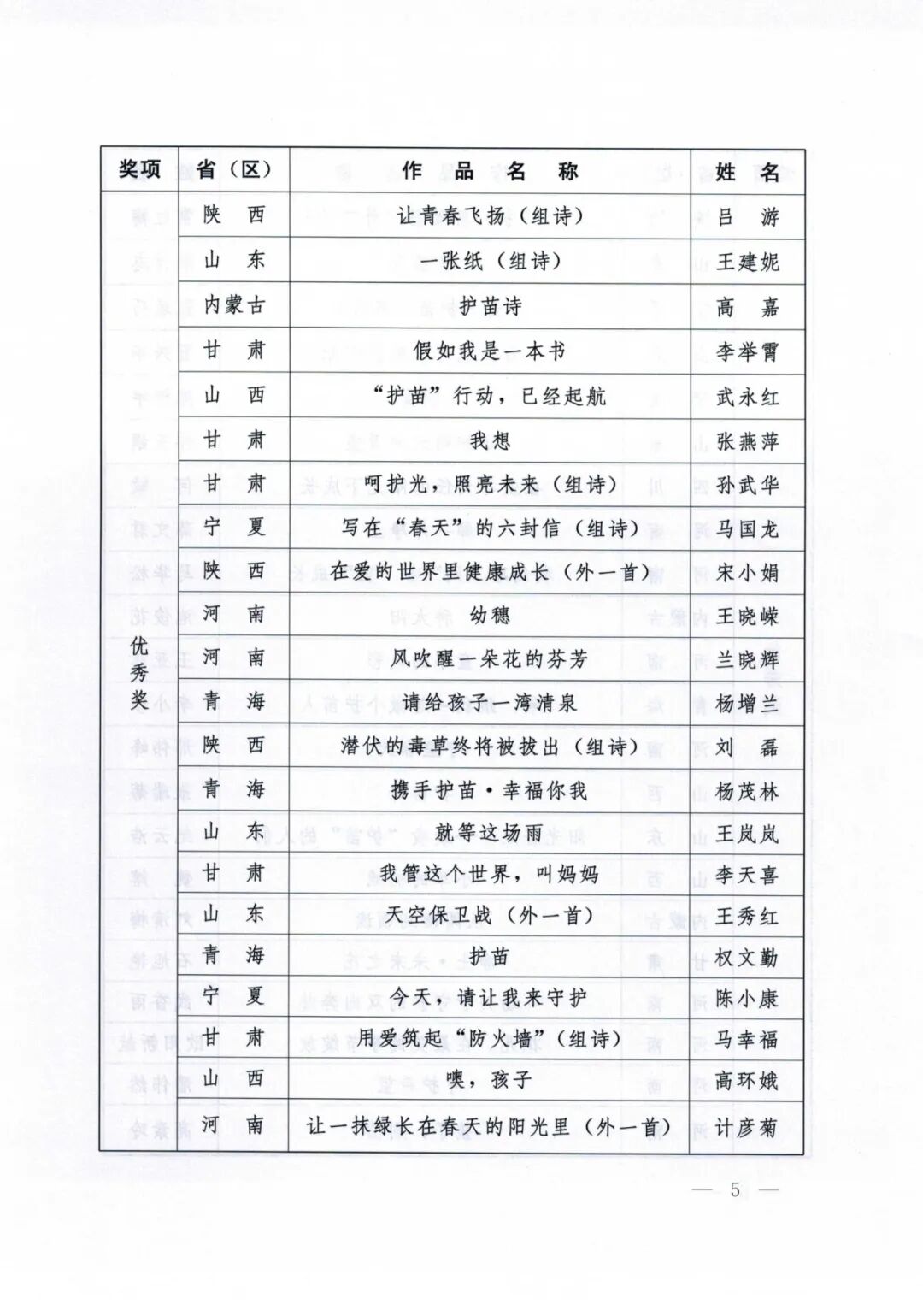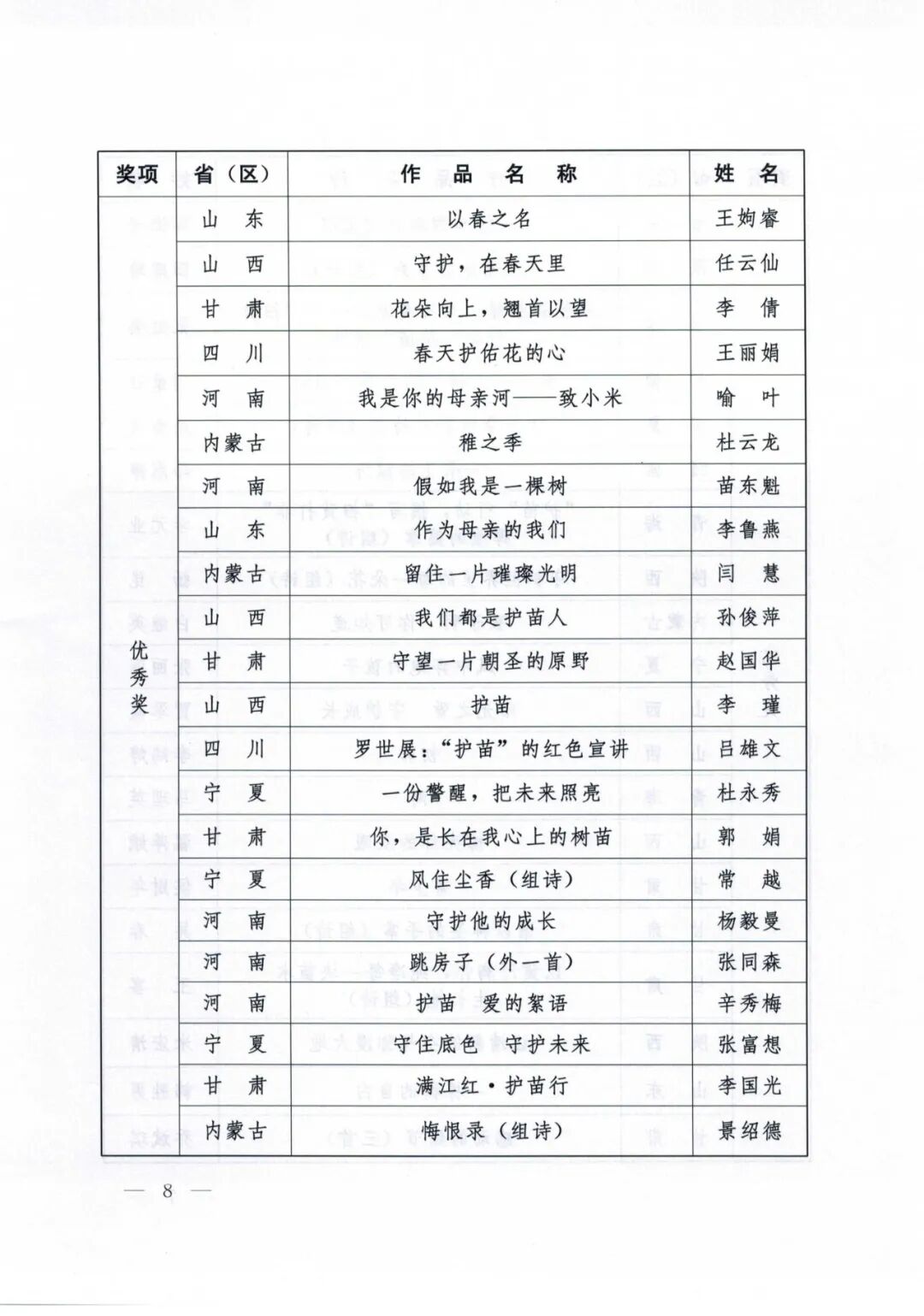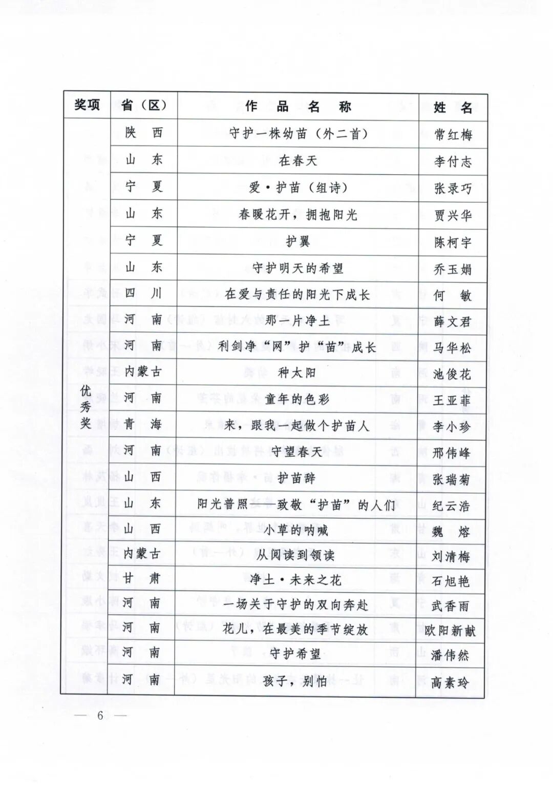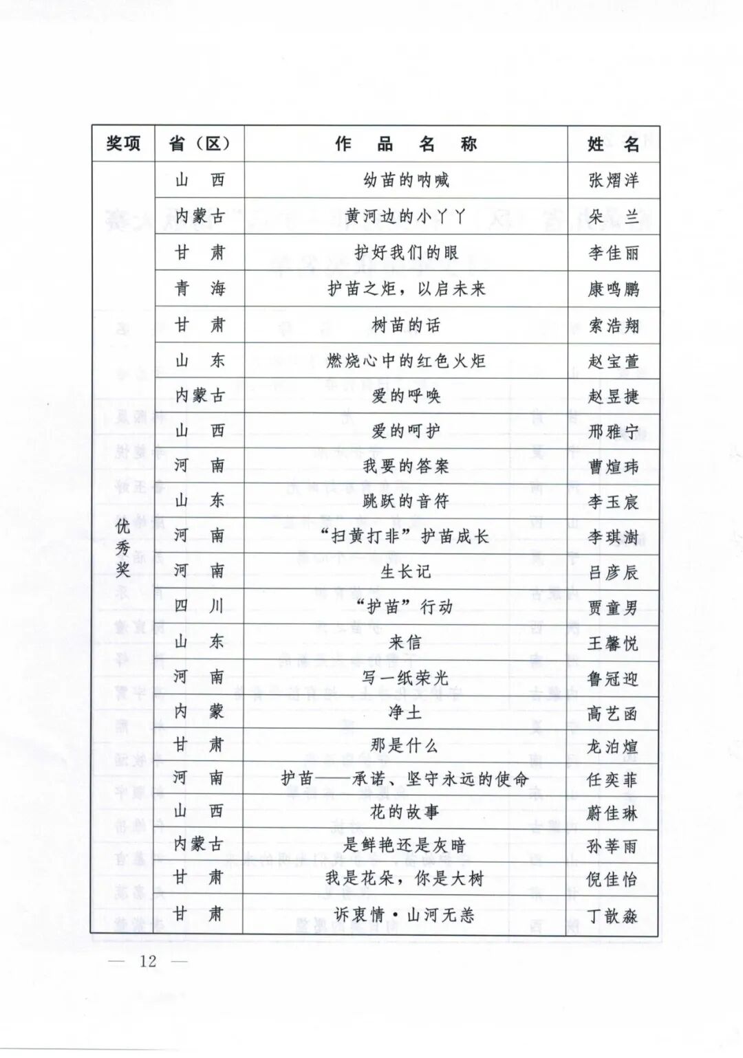 沿黄九省(区)“扫黄打非·护苗”诗歌大赛结果公布了!近日,沿黄九省(区)“扫黄打非·护苗”诗歌大赛获奖名单揭晓。《吹动春苗的风是明亮的》等213篇作品获奖。黄河是母亲河,也是诗河,奔流不息的黄河涌流着滔滔不绝的诗意,每一朵浪花都共鸣着中华民族文化的节奏和韵律。今年2月份起,为认真落实全国“扫黄打非”办公室关于“护苗”工作的总体部署,深化“护苗”品牌宣传,共同营造让孩子们健康成长的文化环境,沿黄九省 (区) “扫黄打非”办公室联合主办了“扫黄打非·护苗”诗歌大赛。此次诗歌大赛立足黄河流域的人文特色,突出“护苗”行动的时代意义,厚植“护苗”行动理念,向全社会发出了净化文化环境、弘扬新风正气的强烈号召!大赛启动以来,沿黄九省 (区) “扫黄打非”办公室精心组织,社会各界广泛关注,广大诗歌爱好者踊跃参赛。大赛组委会共收到766篇推荐作品,经汇总整理及评审委员会专家评审,最终评出优秀作品213篇。其中成人组金奖2名、银奖8名、铜奖16名、优秀奖135名,青少年组金奖1名、银奖2名、铜奖4名、优秀奖45名。沿黄九省(区)通过联合举办“扫黄打非·护苗”诗歌大赛,进一步丰富提升了省(区)间的联防协作,以诗歌这一文学方式推动更多人了解、认可“护苗”行动并积极参与到“护苗”行动中来,进一步巩固了“扫黄打非”工作基层防线。